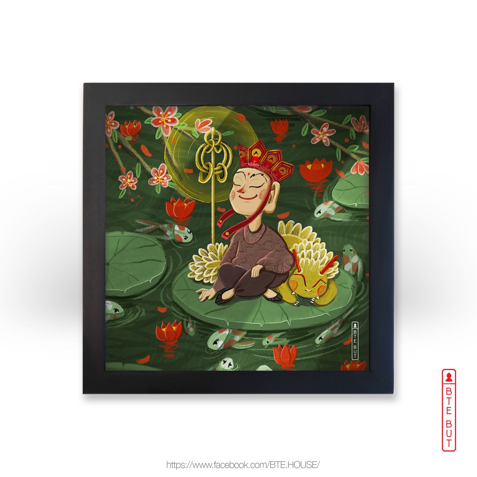 Ngài Địa Tạng Bồ Tát đang tọa thiền trên lá sen, tay cầm tích trượng, kế bên Ngài là chú Đề Thính đang an yên say giấc. Hình ảnh Ngài hòa mình với làn gió trong lành gợi lên sự bình yên, thanh tịnh khiến những chú cá vốn nhút nhát cũng phải ngước lên ngắm nhìn.