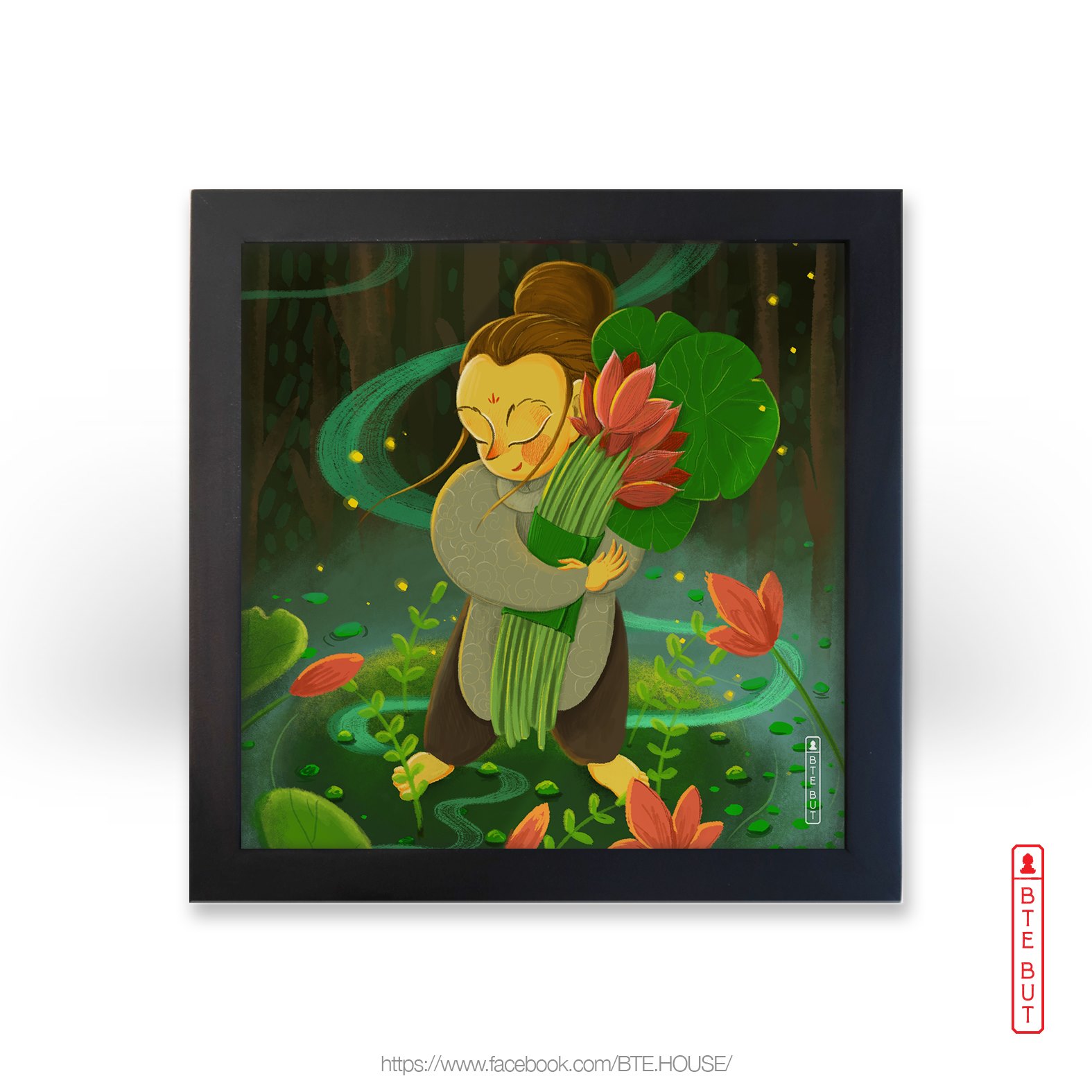 Quan Âm với trang phục mộc mạc đang ôm bó sen một cách thật nâng niu . Gương mặt ngài toát lên nét hiền hậu , bình yên. Giữa vườn sen ngài ôm vào mình những cành sen tươi đẹp nhất và nhắm mắt để cảm nhận mùi hương của sen vẫn đang vương vấn ở xung quanh . Tình yêu thương của mẹ Quan Âm lan tỏa sự ấm áp đến với muôn...
